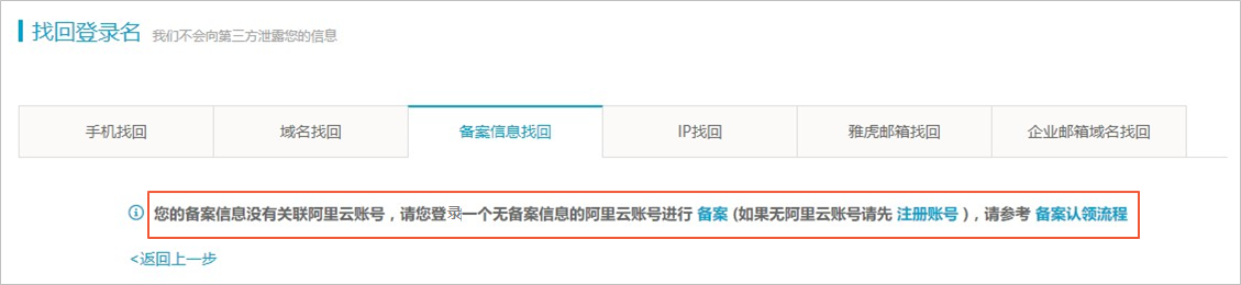 當(dāng)界面能正常跳轉(zhuǎn)至找回登錄名頁面時,您可以根據(jù)界面提示,找回登錄名后直接登錄阿里云ICP代備案管理系統(tǒng)進行備案信息管理。